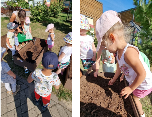 Kukesaba rühma lapsed külavavad esimesed seemned taimekastidesse.